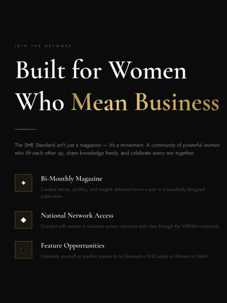 The SHE Standard is the flagship publication of The Women in Business National Network - a bimonthly magazine created for powerful, experienced, and unapologetically women in business.